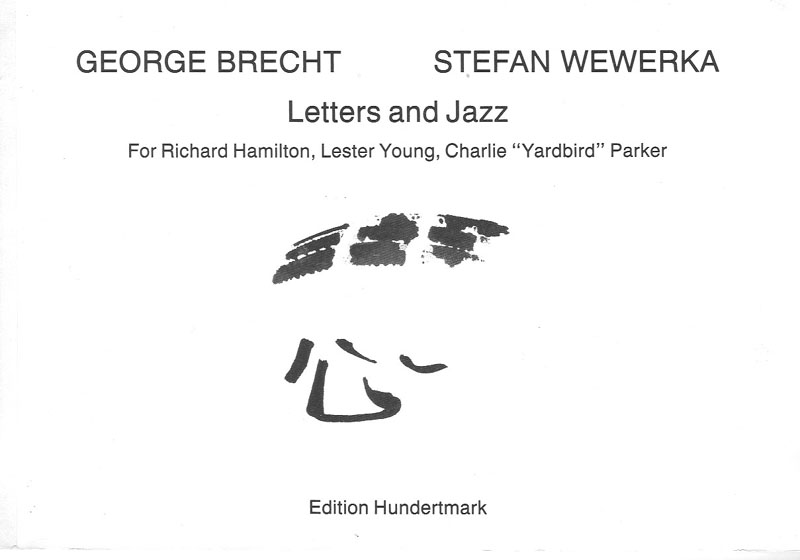 Brecht, George [und] Stefan Wewerka: Letters and Jazz. For Richard Hamilton, Lester Young, Charlie „Yardbird“ Parker. Auflage: 1000 Exemplare. Köln. Edition Hundertmark. 1983. 21 x 15 cm. 16 unpaginierte S. OKarton. Sehr gutes Exemplar. Heft 13 der Edition Hundertmark. Durchgehend mit meist farbigen Abbildungen versehen. [Vgl. Michael Glasmeier / Die Bücher der Künstler, Nummer 10, S. 25.]