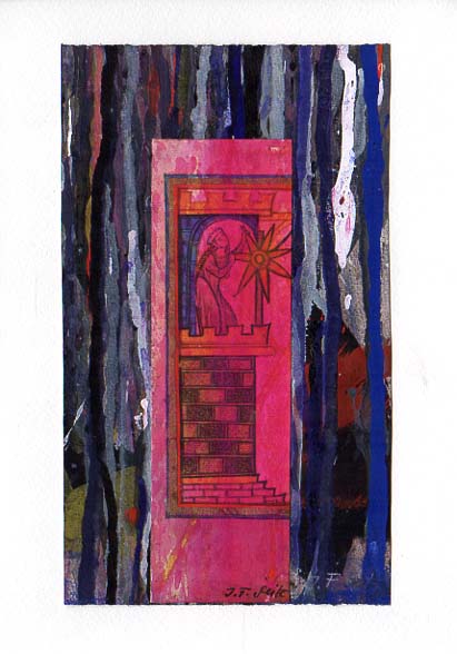 Seitz, Josef Ferdinand: Handschriftliche Weihnachts- und Neujahrskarte mit originaler gouachierter Collage. o. O. o. V. 1991. 21,1 x 14,9 cm (Karte); 17,8 x 10,5 cm (Gouache) 3 S. Sehr gutes Exemplar. Originalarbeit des deutschen Künstlers Josef Ferdinand Seitz (1942 – 2006), doppelt signiert und monogrammiert im Bild unten rechts. Die Klappkarte mit handschriftlichem, 10-zeiligem Weihnachts- und Neujahrsgruß des Künstlers.