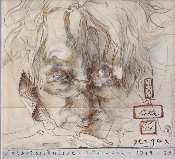 Janssen, Horst: Ergo. 1. Auflage. Stuttgart. J. G. Cotta´sche Buchhandlung Nachfolger. 1979/1980. 24 x 24 cm. 222 S., 1 Blatt. OHalbleinen mit illustriertem OUmschlag. Umschlag mit kleinen Randbereubungen, kleine beschabte Stelle am Rücken. Sonst gutes Exemplar. Durchgehend mit meist farbigen Abbildungen versehen. Mit dem beiliegendem Nachwort von Claus Clément.Mit eigenhämdiger monogrammierter Signatur von Horst Janseen auf dem Vorsatzblatt!