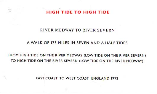 Long, Richard: High Tide to High Tide. Bei Konrad Fischer. Platanenstrasse 7. 4000 Düsseldorf 1. Eröffnung: 7. Nov. 1992, 15 – 18 Uhr [Postalisch gelaufene Einladungskarte]. Erste Auflage. Düsseldorf. Galerie Konrad Fischer. 1992. 11,1 x 19,2 cm. 1 S. Bedruckte Pappkarte. Recto minimalst fleckig, sonst gutes Exemplar. Postalisch gelaufene Einladungskarte Richard Longs für eine Ausstellungseröffnung bei der Galerie Konrad Fischer in Düsseldorf. Die Ausstellung lief vom 7. November bis zum 2. Dezember 1992.