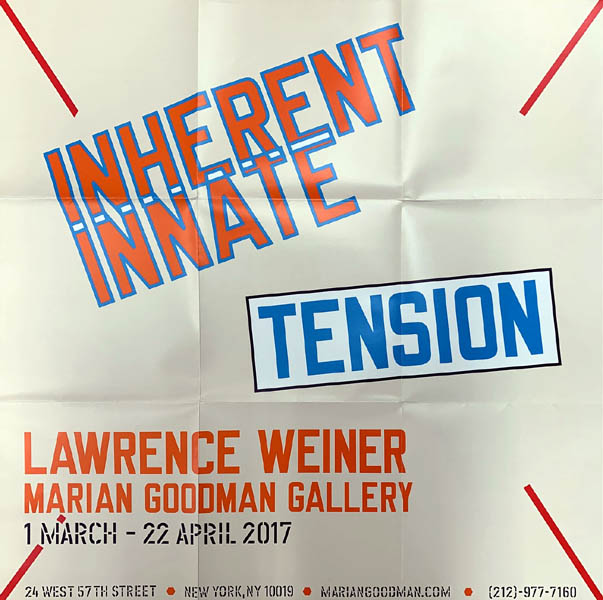 Weiner, Lawrence: INHERENT INNATE TENSION. Lawrence Weiner Marian Goodman Gallery New York. 1 March – 22 April 2017. Erste Auflage. New York. Marian Goodman Gallery. 2017. 69 x 69 cm. 1 Blatt. Plakat/Poster. 2 Falzen gering berieben, sonst sehr gutes Exemplar. Gefaltet wie ausgeliefert. Faltplakat zur gleichnamigen Ausstellung von Lawrence Weiner in der Marian Goodman Gallery, New York.