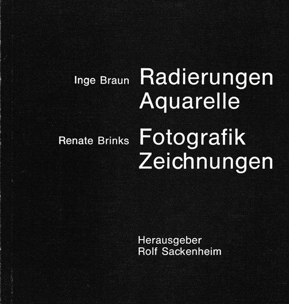 Braun, Inge [und] Renate Brinks: Radierungen. Aquarelle. / Fotografik. Zeichnungen. Heerausgeber Rolf Sackenheim. Erste Ausgabe. Münsterschwarzach. Vier-Türme Verlag. 1977. 212 x 20 cm. 82 unpaginierte S. OKarton. Einbandkanten mit kleinen Bereibungen. Gutes Exemplar. Werkstattberichte. Übungen – Experimente – Ergebnisse von Künstlern der Gegenwart. Band 13. Durchgehend mit ganzseitigen Abbildungen zum Werk beider Künstlerinnen versehen.