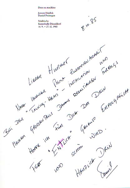 Hajduk, Janusz [und] Daniel Poensgen: Deus ex machina. Städtische Kunsthalle Düsseldorf, 14. 9. – 27. 10.1985. Erste Auflage. Düsseldorf. Städtische Kunsthalle. 1985. 28 x 22 cm. 32 S. OKarton. Umschlag etwas angestaubt, sonst sehr gutes Exemplar. Enthält 11 s/w Abbildungen von Arbeiten Poensgens sowie 10 Hajduks. Schöne, quer über den Titel verfasste zehnzeilige persönlich handschriftliche Widmung Daniel Poensgens, signiert Daniel, datiert 8.10.85.