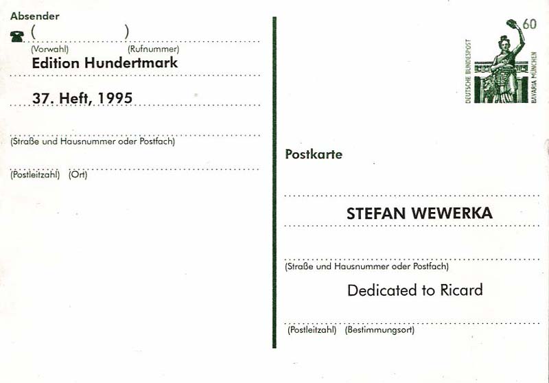 Wewerka, Stefan: Postkarten. Dedicated to Ricard. Auflage: 500 Exemplare. Köln. Edition Hundertmark. 1995. 10,5 x 14,5 cm. 16 unpaginierte Blatt. OKarton. Sehr gutes Exemplar. Heft 37 der Edition Hundertmark. Als Postkartenheftchen der Deutschen Bundespost von Wewerka entfremdet. Beiliegend eine Einladungskarte der Galerie Hundermark zur Ausstellung vom 15.9. – 31.10.1995 als „Wewerka-Postkarte“.
