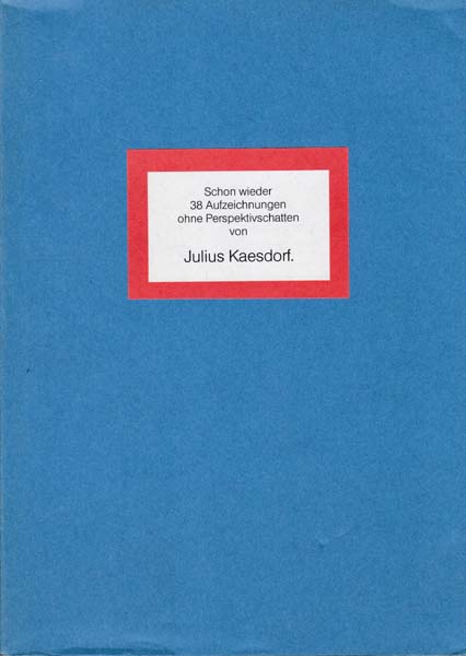Kaesdorf, Julius: Schon wieder 38 Aufzeichnungen ohne Perspektivschatten. Auflage: 300 Exemplare. Kissleg. Edition Schloßhofgalerie Ewald und Dorothea Schrade. 1984. 29,5 x 21 cm. 82 unpaginierte Doppelseiten. OKarton mit OKlappenumschlag und montiertem Titelschild. Klappenumschlag teilweise etwas berieben und mit kleinem Einriss (sauber hinterlegt), sonst gutes Exemplar. Nummer 107 von 300 handschriftlich numerierten und signierten Exemplaren. Feinstrichige, figürliche (reproduzierte) Bleistiftzeichnungen, meist mit einem außerhalb des Bezugs stehenden kleinen ironischen Text untermalt.