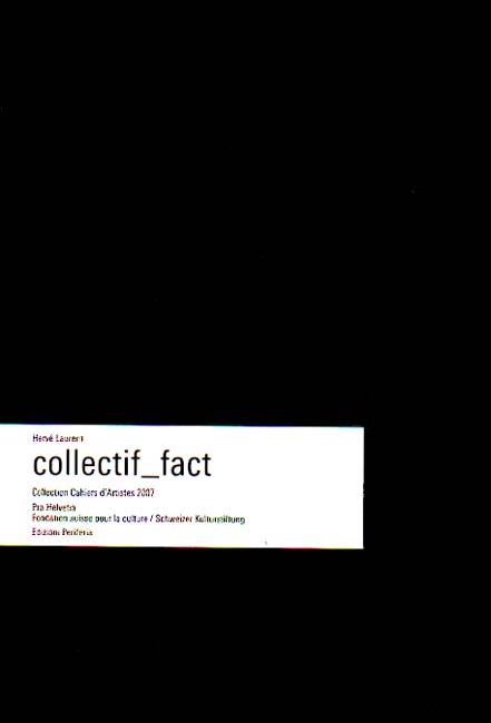 Laurent, Herve: collectif fact. Collection Cahiers d´Artistes 2007. [Auflage: 1200 Exemplare]. Luzern. Poschiavo. Edizioni Periferia. 2007. Groß 8°. 48 unpaginierte S. OKarton mit OKLappenumschlag. Verlagsfrisches, neuwertiges Exemplar. Pro Helvetia. Fondation suisse pour la culture / Schweizer Kulturstiftung. Das aus Annelore Schneider (1979), Swann Thommen (1979) und Claude Piquet (1977) bestehende Kolektiv lebt und arbeitet in Genf. Mit einem Ausstellungsverzeichnis und einem Text in Deutsch und Französisch. Beiliegend 2 Motive als Postkarten. Die Editions Collection Cahiers d´Artistes befasst sich mit jungen Künstlern und Fotografen der nach Mitte der 60er Jahre geborenen Generationen, die in der Schweiz leben und arbeiten.