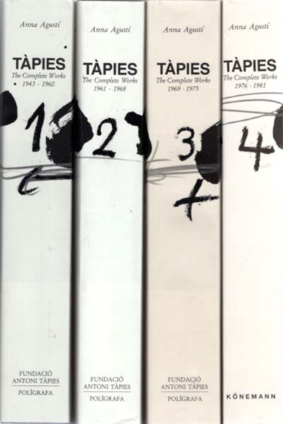 Tapies, Antoni: The Complete Works. Volume 1. 1943-1960; Volume 2. 1961-1968; Volume 3. 1969 – 1975; Volume 4. 1976 – 1981. Direction and cataloging Anna Augusti. Forword Georges Raillard. Chronology Miquel Tapies. Erste Englische Ausgabe. 4 Bände / Four volumes. Barcelona. New York. Köln. [Band 1 – 3] Fundacio Antoni Tapies / Edicions Poligrafa – [Band 4] Könnemann. 1988 – 1996. 32 x 30 cm. 546; 511; 575; 483 S. OLeinen mit OUmschlag. Umschläge an den Rücken gering aqufgehellt, sonst sehr gutes Exemplar. Die ersten vier Bände 1943 – 1981 der englischsprachigen Ausgabe, die inzwischen auf 9 Bände bis 2011 angewachsen ist. Der Werkkatalog umfasst 4186 Arbeiten auf Papier und Leinwand, alles abgebildet (3689 s/w und 768 Farbbabildungen). Notationen und einführender Text in Englisch..