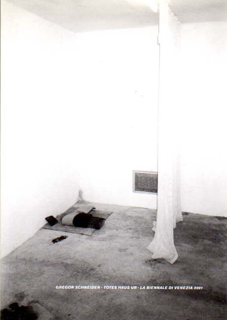 Schneider, Gregor: Totes Haus ur. La Biennale di Venezia 2001. Erste Auflage. Ostfildern-Ruit. Hatje Cantz Verlag. 2001. 24 x 17 cm. 103 S. OKarton mit illustriertem OKlappenumschlag. Umschlag am oberen Rand gering berieben, sonst sehr gutes Exemplar. Texte in Deutsch und Englisch. Mit Beiträgen von Udo Kittelmann, Elisabeth Bronfen und Daniel Birnbaum. Durchgehend mit s/w Abbildungen versehen. Erschien anläßlich der gleichnamigen Ausstellung, La Biennale di Venezia, Deutscher Pavillon, 10.6. – 4.11.2004. Beiliegend eine Fotopostkarte von Gregor Schneider, „APOCALYPSE“, vom Künstler verso mit siebenzeiligem handschriftlichem Text versehen, gerichtet an einen Kunsthistoriker. Schließt mit einer Einladung, mit „G“ monogrammiert.