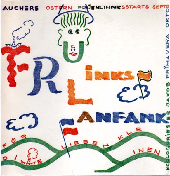 Wewerka, Stefan: Für die Lieben Kleinen. Stefan Wewerka´s Frühlingskindermalbuchwalzer. Herausgeber Diter Roth + Rudolf Rieser. Auflage: 2000 Exemplare. Stuttgart. Köln. London. Edition Hansjörg Mayer. 1969. 22 x 22 cm. 6 Doppelblatt, 2 Blatt. Farbig illustrierter OKarton. Sehr gutes, frisches Exemplar. 10 Seiten mit Strichzeichnungen Wewerkas, unterlegt mit gedruckten Kurztexten in Margenta.