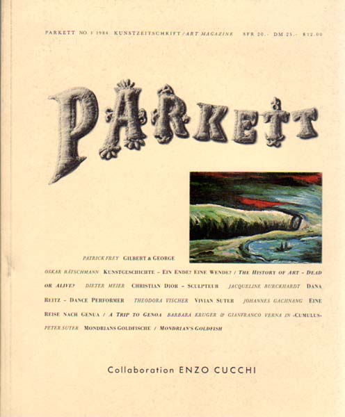 Parkett. Kunstzeitschrift / Art Magazine. Nummer 1 / 1984. Collaboration Enzo Cucchi. Herausgeber Peter Blum, Jacqueline Burckhardt, Bice Curiger, Walter Keller. 1. Auflage. Zürich. Parkett Verlag. 1984. 26 x 21 cm. 97 S., 9 Blatt. OKarton. Sehr gutes Exemplar. Parkett ist eine der renomiertesten und ambitioniertesten Kunstzeitschriften im deutschsprachigen Raum mit zunächst vierteljährlichem Erscheinen. Zu jeder Nummer erschien geleichzeitig eine Vorzugsausgabe mit Objekten, Grafiken oder Multiples der Künstler, die für die jeweilige Nummer zur Zusammenarbeit gewonnen werden konnten. Zu der breiten Vorstellung eines oder zweier Künstler (Enzo Cucchi), die auch gleichzeitig einen Originalbeitrag leisten – „Collaboration“ – kommen jeweils aktuelle Themen mit Bezug zur Zeitgenössischen Kunst, in diesem Heft u.a. Meret Oppenheim, Vivian Suter, Tanzperformance, Christian Dior.
