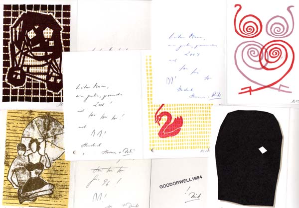 Lumen, Dirk [d.i. Dirk van der Meulen]: Konvolut von eigener Hand gestalteter Glückwunsch- und Postkarten. 1 Karte gelocht, sonst sehr guter Zustand. Dirk Lumen (Künstlername seit 1981), geboren 1945 als Dirk van der Meulen in Gronau / Westfalen. 1968-1975 Studium an der Staatlichen Hochschule für Bildende Künste, Berlin bei Volkert u. Thieler, 1975 Meisterschüler.