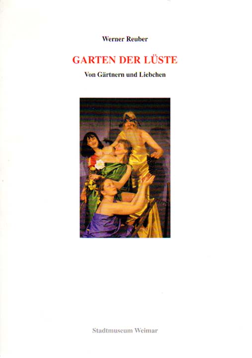 Reuber, Werner: Garten der Lüste. Von Gärtnern und Liebchen. Stadtmuseum Weimar, 5.7.-2.9.2001. Erste Auflage. Weimar / Düsseldorf. Stadtmuseum Weimar / Edition Ultra Violett. 2001. 27 x 19 cm. 72 unpaginierte S. OKarton. Gutes bis sehr gutes Exemplar. Texte von Carl Friedrich Schröer, Rüdiger Wiese, Geirg Bussmann und Volkhard Knigge. Durchgehend mit montierten Farbabbildungen versehen. Beiliegend: Errata.