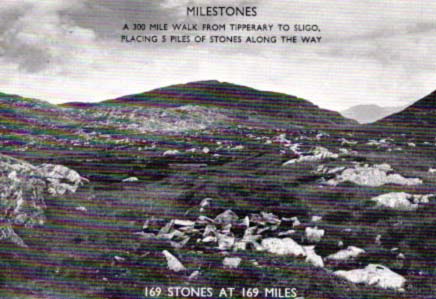 Long, Richard: Milestones. A 300 Mile Walk from Tipperary to Sligo. Placing 5 Piles of Stones allong the Way. [Einladungskarte]. Basel. Galerie Rolf Preisig. 1979. 16,2 x 11,3 cm. Gutes Exemplar. Einladungskarte zur Ausstellung in der Galerie Preisig vom 6. April bis 5. Mai 1979 unter Verwendung des s/w Fotos 169 Stones at 169 Miles. Postalisch gelaufen.