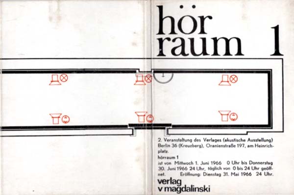 Magdalinski, V.: hör raum 1. 2. Veranstaltung des Verlages (akustische Ausstellung). Bln. Verlag V. Magdalinski. 1966. 15 x 15,5 cm. 16 unpaginierte S. OKarton mit OKlappenumschlag. Umschlag etwas angestaubt, gutes Exemplar. Enthält 16 Manuskriptseiten (blanko) für Notizen, die entsprechend der auf dem Innendeckel angegebenen Anweisungen im Hörraum, analog dem Wahrgenommenen, notiert werden sollten. Daraus sollte eine Publikation erfolgen. Der Hörraum selber war als Klanginstallation angelegt. Beiliegend eine Teilnehmerkarte für eine Person.