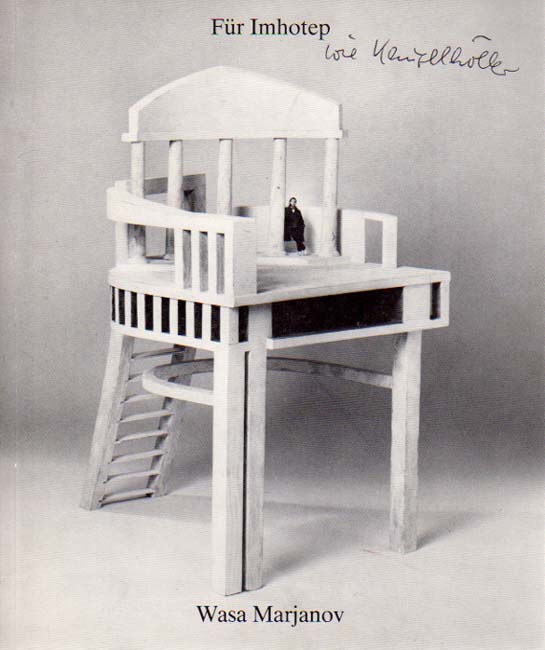 Marjanov, Wasa: Für Imhotep. Erste Auflage. Düsseldorf. Selbstverlag. 1984. 25 x 21 cm. 64 S. OKarton. Kleine handschriftliche Notiz auf dem Einband, Rücken etwas angeplatzt. Ordentliches Exemplar. Mit einem Text von Ulrich Krempel und einigen Werkabbildungen. Beiliegend eine Einladungskarte der Galerie Blau an die Galerie Schmela sowie eine weitere Einladungskarte der Kunststiftung Baden-Würtemberg.