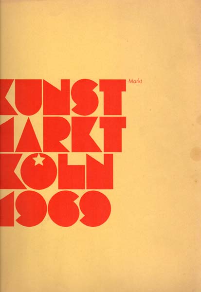 Kunstmarkt 69. Ausstellung – Markt. [Verein progressiver deutscher Kunsthändler Köln.] Köln. [Verein progressiver deutscher Kunsthändler Köln.] 1969. 45 x 32 cm. 46 unpaginierte S. OKarton. Umschlag etwas angestaubt und fleckig. Ordentliches Exemplar. Katalog zum dritten Kölner Kunstmarkt 1969. Unter den Galerien sind Denise Rene, Brusberg, Neuendorf, Niepel, Ricke, Schmela, van de Loo, Der Spiegel und Zwirner sowie weitere. Mit zahlreichen Abbildungen der gezeigten Werke und Objekte. Vorangestellt, über Kopf lesbar, die Ausstellung „Eine Tendenz zeitgenössischer Malerei“ mit Arbeiten u.a. von Graubner und Louis.