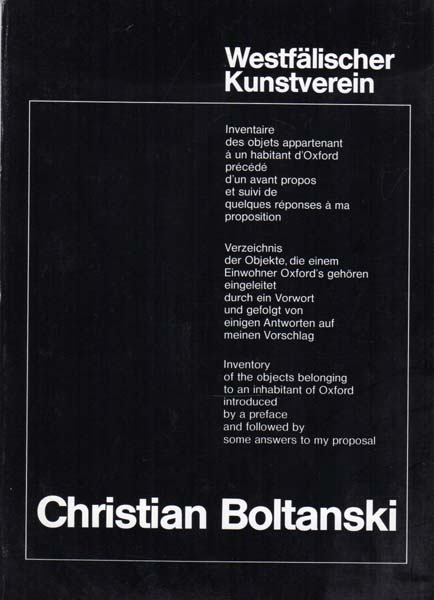 Boltanski, Christian: Inventaire des objets appartenant a un habitant d’Oxford precede d’un avant propos et suivi de quelques reponses a ma proposition. Verzeichnis der Objekte, die einem Einwohner Oxford´s gehören eingeleitet durch ein Vorwort und gefolgt von einigen Antworten auf meinen Vorschlag / Inventory of the objects belonging to an inhabitant of Oxford intruduced by a preface and followed by some answers to my proposal. 1. Auflage. Münster. Westfälischer Kunstverein. 1973. 21 x 15 cm. 80 unpaginierte S. OKarton. Kanten minimalst berieben. Sehr gutes Exemplar. Gezeigt werden auf 344 kleinen s/w Fotos das Inventar eines Einwohners aus Oxford sowie auf 10 Tafeln Briefe und Dokumente. Stempelnummeriertes Exemplar einer kleinen Vorzugsauflage (wohl 300), die von Christian Boltanski auf dem Titelblatt handschriftlich signiert ist. [Vgl. Calle, S. 32; Flay Nr. 31, jeweils mit Abbildung].
