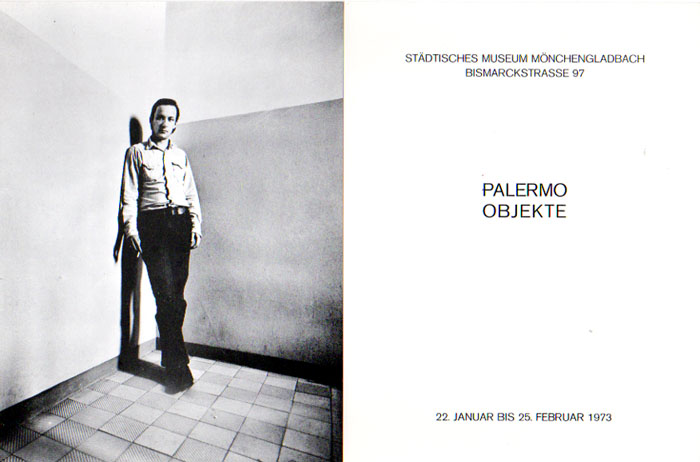 Palermo, Blinky [d.i. Peter Heisterkamp]: Objekte. 22. Januar bis 25. Februar 1973. Städtisches Museum Mönchengladbach. Auflage 440 nummerierte Exemplare. Mönchengladbach. Städtisches Museum Mönchengladbach. 1973. 21 x 17 cm. 34 lose Tafeln. Weisse OPapp-Kassette. Die Titelkante etwas gebräunt, die anderen Kanten leicht nachgedunkelt. Zwei Stecknadelkopfgroße Fleckchen auf dem Deckel, teils gering angestaubt, sonst noch sehr gutes Exempolar., Nummer 112 von 440 nummerierten Exemplaren mit einer Original – Bleistiftzeichnung Palermos auf dem Kassettendeckel (2 hauchdünne über den Deckel gezogene, voneinander weglaufende Bleistiftlinien). Enthält 1 Titeltafel, verso mit einführendem Text von Johannes Cladders, 1 Foto Palermos, 1 Texttafel mit einem Textauszug aus James Joyce „Ulysses“, 30 Fototafeln mit Werkwiedergaben, Fotos von Peter Dibke und Kristin Heisterkamp sowie ein Verzeichnis der nicht abgebildeten Objekte. [Vgl. Glasmeier, Die Bücher der Künstler 446; Fricke 10. 383].