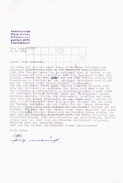 Ulrichs, Timm: Maschinenschriftlicher Brief, datiert 3. 6. 1985. 1 S. DIN A4. Sehr gutes Exemplar. Ganzseitiger Brief des Concept-Künstlers an den ehemaligen Direktor des Hamburger Kunstsvereins, Uwe Schneede, hinsichtlich eines Wettbewerbvorschlages an die Hamburger Kunstkomission. Handschriftlich signiert, verso eine gedruckte Konzeptarbeit mit handschriftlichem Titel „creation – reaction“. Dabei 12 Seiten DIN A4 kopierte Briefe und Entwürfe im Zusammenhang mit dem Wettbewerbsvorschlag sowie 2 gefaltete kopierte Pläne für ein Mahnmal gegen den Faschismus in Hamburg-Harburg.