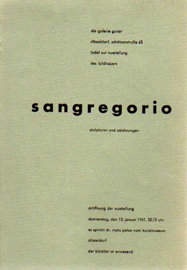 Sangregorio, Giancarlo: Skulpturen und Zeichnungen. Erste Auflage. Düsseldorf. Galerie Gunar. 1961. 21 x 15 cm. 2 Blatt. OKarton. Sehr gutes Exemplar. Mit einem Text von Franco Russoli und 1 schwarzweissen Abbildung. Ausstellungskatalog der Galerie Gunar, Düsseldorf, ab Januar 1961. Dabei: Galleria Levi, Milano. Mostra No. 5, 10 gennaio 1963, 8 S., OKarton.