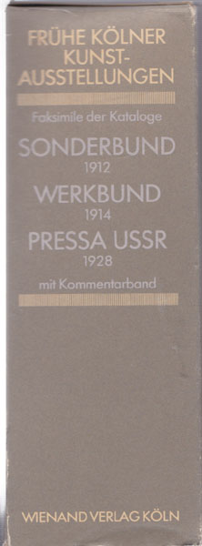 Herzogenrath, Wulf [Herausgeber]: Frühe Kölner Kunstausstellungen. Sonderbund 1912. Werkbund 1914. Pressa 1928. Kommentarband zu den Nachdrucken der Ausstellungskataloge. Mit Beiträgen von Wolfram Hagspiel und Dirk Teuber. [Auflage 1000 Exemplare]. 4 Bände. Köln. Wienand Verlag. 1981. 20 x 7 cm (Papschuber). 103 S., 122 unpaginierte S. mit Abbildungen, XXXVIII S. Anzeigen (Sonderbund), 263 S., X S. Anzeigen, 122 S. (Werkbund), 111 S. (Pressa), 335 S., 3 Blatt ( Kommentar). OKarton in OPappschuber. Schuberkanten etwas nachgedunkelt und läsiert, 2 S. im Pressa-Katalog mit kleinem Ausriss am unteren Rand ohne Textverlust, Einbandkanten von „Pressa“ und „Werkbund“ mit kleinen Bereibungen. Sonst gutes bis sehr gutes Exemplar. Faksimile der 3 Kataloge mit ausführlichem Kommentarband!
