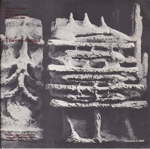 Etienne-Martin: Etienne Martin. Demeure. Erste Auflage. Paris. Galerie Breteau. 1960. 21,5 x 22,5 cm. 8 Blatt, teilweise unaufgeschnitten. Illustrierter OKarton. Einbandecken und -kanten mit kleinen Bereibungen. Sonst gutes bis sehr gutes Exemplar. Aufwändig gestalteter Katalog zur Ausstellung Paris Dezember 1960 durchgehend mit Abbildungen sowie fensterförmigen Ausschnitten zwischen den Seiten in Form eines „D“ wie „Demeure“ und illustrierten Seiten aus Cellophan versehen. Text in französischer Sprache.