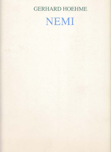 Hoehme, Gerhard: Nemi. 17. bis 30. April 1994, Mamorsaal im Weissenburgpark Stuttgart. 1.Auflage. Stuttgart. Roman Zenner. 1994. 32,5 x 25 cm. 36 unpaginierte S. OKarton mit OKLappenumschlag. Einbandkanten etwas nachgedunkelt und berieben. Sonst gutes Exemplar. Mit einem Text von Gottfried Boehm und 8 farbigen Bildtafeln.