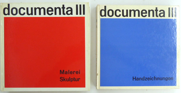 documenta 3. [Katalogbuch zur Dokumenta 3, Kassel]. Internationale Ausstellung 27. Juni – 5. Oktober 1964 Kassel, Alte Galerie, Museum Fridericianum, Orangerie. Band 1: Malerei / Skulptur; Band 2: Handzeichnungen. Band 1 Erste Auflage; Band 2 Zweite Auflage. 2 Bände. Köln DuMont Schauberg Verlag. 1964. 22 x 22 cm. 415 S; 240 S. Illustrierter OPappband. Folierung am Kapital leicht gelöst, Schnitt etwas nachgedunkelt. Gutes bis sehr gutes Exemplar. Durchgehend mit schwarz-weiß, teilweise farbige Abbildungen auf Tafeln versehen. Band 1 und 2 von 3 (Grafik).