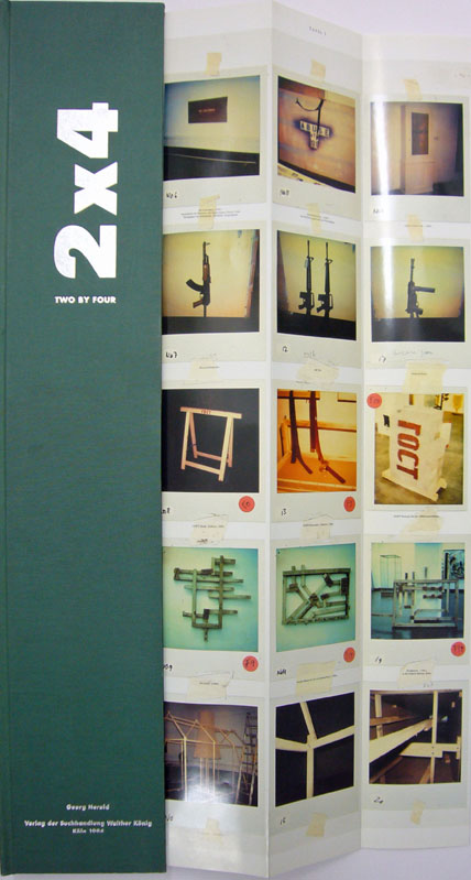 Herold, Georg: Mutter des Tafelwerks. 2 x 4. Two by Four. Auflage 55 (+) Exemplare. Köln. Verlag der Buchhandlung Walther König. 1996. 68,5 x 13,3 cm. 28 Falttafeln. OLeinen mit Titelsilberprägung. Einband sehr gering staubschlierig, sonst sehr gutes Exemplar. Künstlerbuch mit 597 farbigen Wiedergaben von Polaroids, vierfach gefalzt auf das Buchformat 12,4 x 69 cm. Numer 41 / 55 handschriftlich nummerierten und von Georg Herold signierten Exemplaren [davon sind die Nummern 1-5 mit einer Kassette, die das gestempelte und signierte Holzobjekt ‚Vater des Tafelwerkes‘ enthält, versehen]. Aufgefaltet 67,8 x 58,8 cm.