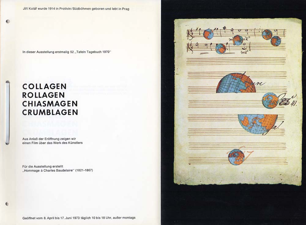 Kolar, Jiri: Collagen – Rollagen – Chiasmagen – Crumblagen. Museum Haus Lange, Krefeld. 8. April bis 17. Juni 1973. 1. Auflage. Krefeld. Museum Haus Lange. 1973. 30 x 21 cm. 18 lose Blatt mit Ringbuchschlaufenbindung. OKarton mit Ringbuchlochung und gummibeschichteter Original – Ringschlaufe. Deckblatt etwas angestaubt, sonst sehr gutes Exemplar. Erschien als Loseblattsammlung Einlage 5 für das Ringbuch 6 des Museum Haus Lange. Mit einer Einführung von Paul Wember und mehreren Abbildungen, teils auf Klapptafeln.