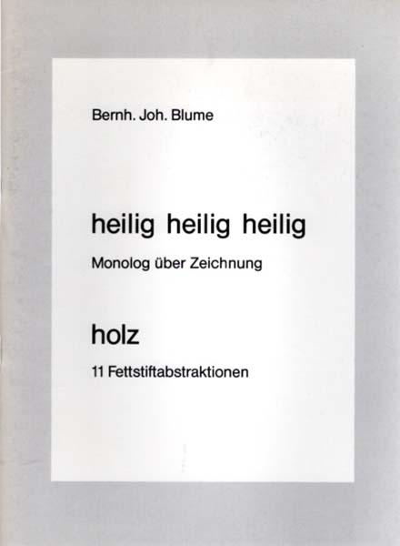 Blume, Bernhard Johannes: heilig heilig heilig. Monolog über Zeichnung. holz. 11 Fettstiftabstraktionen. Erste Auflage. Köln. Selbstverlag. 1986. 27 x 20 cm. 24 unpaginierte S. OKarton. Umschlag minimal angestaubt. Gutes bis sehr gutes Exemplar. Durchgehend mit SW-Abbildungen versehen sowie einem Text von Blume.