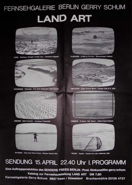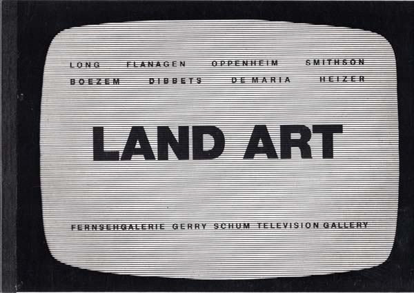 Schum, Gerry: Land Art. Long – Flanagen – Openheim – Smithson – Boezem – Dibbets – De Maria – Heizer. Fernsehgalerie Gerry Schum Television Gallery. Katalog zur Fernsehausstellung LAND ART TV Germany Chanel I, April 69. 2. Auflage – 2nd edition. Berlin. Fernsehgalerie Gerry Schum / Ursula Schum-Wevers. 1970. 21 x 15 cm. Ca. 400 unpaginierte S. OKarton mit transparentem Umschlagdeckel, Folienstreifenrücken. Katalog und Plakat als makellos frisches, ungenutztes Archivexemplar. Zweite Auflage, fast auf den doppelten Umfang erweitert. Mit dem auffaltbaren Titelblatt als Werbefaltblatt für die Sendung des ARD am 15. April 1969. Enthält eine erläuternde Einführung von Gerry Schum sowie Beiträge zu den Künstlern. Eine der bedeutendsten Ausstellungen der Nachkriegszeit. Beigegeben das sehr seltene – wie ausgegeben zur Einladung gefaltete – Plakat zur Sendung in der ARD am 15. April 1969, mit 8 Film-Stills in Bildschirmansicht. Das Plakat hier verso unbedruckt (es gibt Varianten mit Aufdruck für den Postversand). Dabei ferner die Antwort- und Bestellkarte für die Zweite erweiterte Auflage des Kataloges. Aus dem Archiv von Gerry Schum, als Ensemble in dieser Erhaltung und Vollständigkeit ausgesprochen selten. [Vgl. Stationen der Moderne, Berlin 1988, S.533 ff / Groos / Hess / Wevers: Fernsehgalerie / Videogalerie Gerry Schum. Ready to Shoot. 2003, S. 75-105].