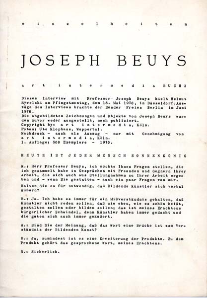 Beuys, Joseph: Einzelheiten. Heute ist jeder Mensch Sonnenkönig. art intermedia Buch 3. Auflage 500 Exemplare. Köln. art intermedia. 1970. 30 x 21 cm. 36 (1) unpaginierte S. OKarton. Gutes bis sehr gutes Exemplar. Das wiedergegebene Interview mit Joseph Beuys hielt Herausgeber Helmut Rywelski am Pfingstmontag, dem 18. Mai 1970, in Düsseldorf. Mit Abbildungen.
