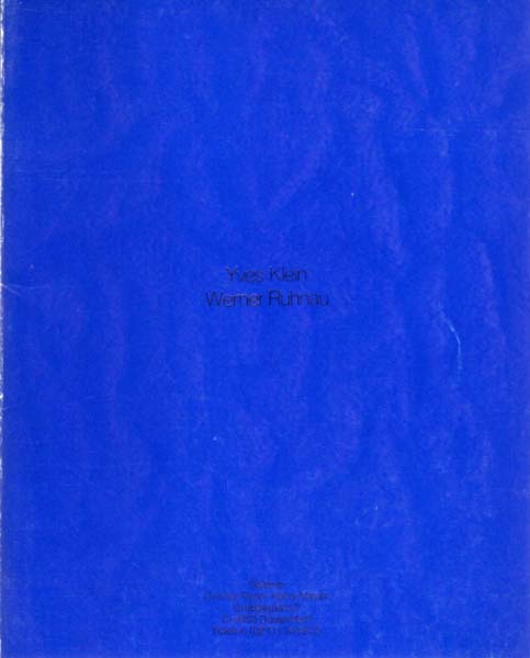 Klein, Yves [und] Werner Ruhnau: Dokumentation der Zusammenarbeit in den Jahren 1957-1960. Zusammenstellung der Dokumentation Heiner Stachelhaus. 1. Auflage. Recklinghausen. Verlag Aurel Bongers. (1976). 26 x 21 cm. 63 S. Blauer OKarton. Umschlag an Rücken und Kanten etwas berieben, eine Kante gering gestaucht. Papier wie meist leicht gebräunt. Gutes Exemplar. Dokumentation der Zusammenarbeit des Architekten Werner Ruhnau und Yves Klein am Theaterbau Gelsenkirchen. Mit Fotowiedergaben auf Tafeln, Skizzen und Briefen. Exemplar anläßlich einer Ausstellung bei Galerie Hans Mayer und Denis Rene Düsseldorf mit silbernem Aufdruck auf dem Einband. Beiliegend drei Einladungskarten zu Yves Klein Ausstellungen bei Galerie Reckermann, 1986, Museum Haus Esters, Krefeld 1994 und Galerie Gmurzynska 1994.