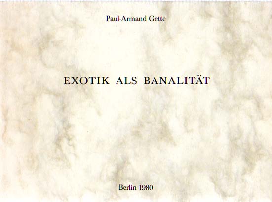 Gette, Paul-Armand: Exotik als Banalität. De l’exotisme en tant que banalite. Auflage 975 Exemplare. Berlin. Edition Copie und Berliner Künstlerprogramm des DAAD. 1980. 14,5 x 20 cm. 46 unpaginierte S. OKarton. Sehr gutes Exemplar. Fotografische Dokumentation über exotische Pflanzen im Berlin der achtziger Jahre.
