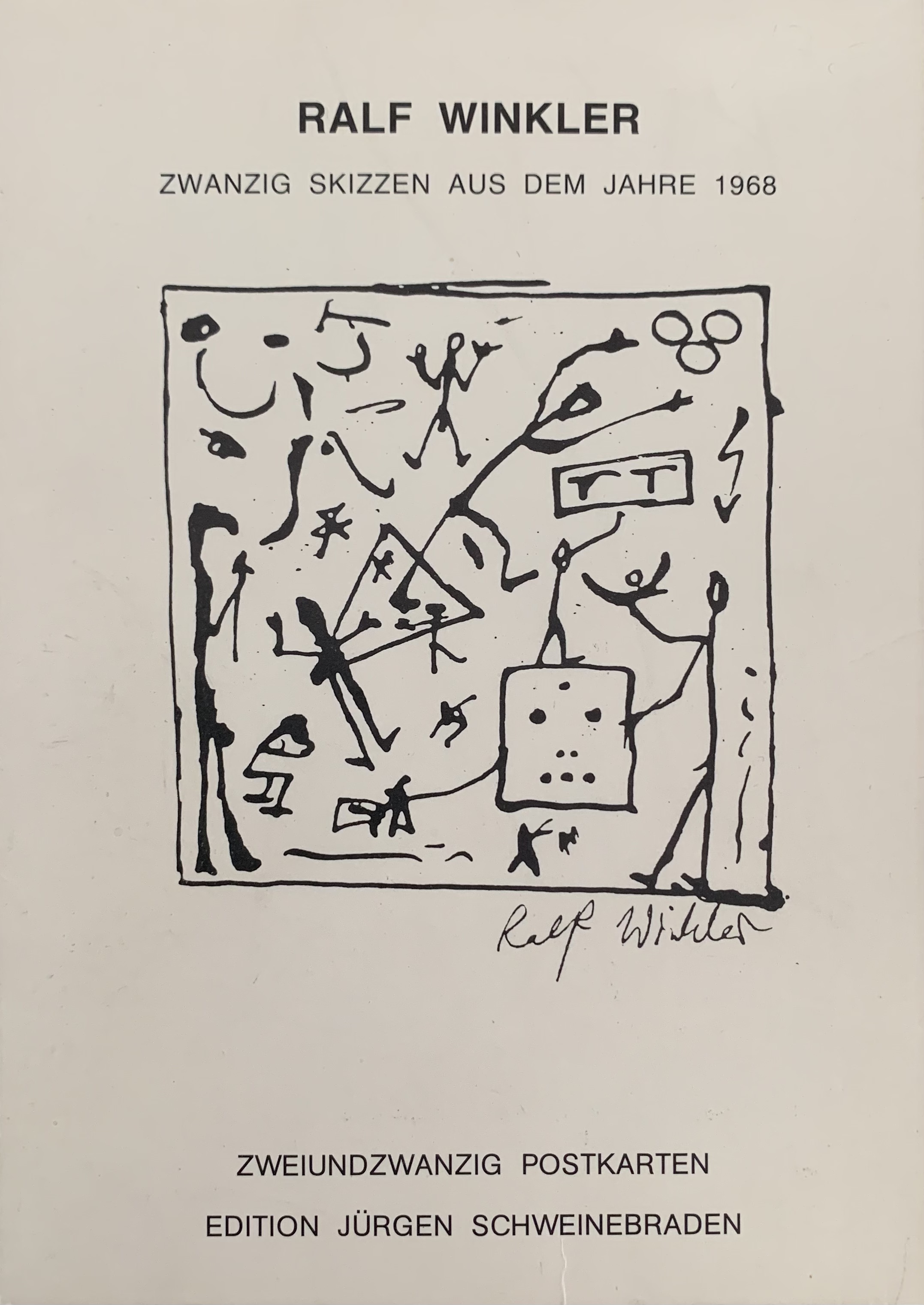 Winkler, Ralf [d.i. A. R. Penck]: Zwanzig Skizzen aus dem Jahre 1968. Zweiundzwanzig Postkarten. Auflage 500 Exemplare. Ohne Ort. EP Edition Jürgen Schweinebraden. Um 1982. 15,5 x 11 cm. 23 lose Karten, 2 Blatt. OKarton-Schachtel. Sehr gutes Exemplar. Enthält 22 Postkarten mit Wiedergegebenen Zeichnungen sowie 1 Titelkarte.