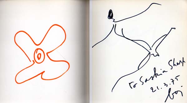 Baj, [Enrico]: Generale – Damen – Möbel – Meccanos – Spiegel – „Guernica“ – „La Grande Jatte“. 1960-1974. Städtische Kunsthalle Düsseldorf, 21. März bis 27. April 1975. 1. Auflage. Düsseldorf. Städtische Kunsthalle Düsseldorf. 1975. 23 x 24 cm. 72 unpaginierte S. OKarton. Obere Stoßkante gering gestaucht, sonst gutes Exemplar. Mit einer Einführung von Jürgen Harten und einem Text von Emilio Tadini sowie zahlreichen Abbildungen. Auf dem Vorsatz eine handschriftliche Widmung Bajs , signiert, datiert mit der Ausstellungseröffnung 21.3.75, darüber eine schwarze Filzstiftzeichnung des Künstlers über den größten Teil der Seite. Auf dem gegenüberliegenden inneren Einbanddeckel eine ganzseitige stilisierte rote Blume.