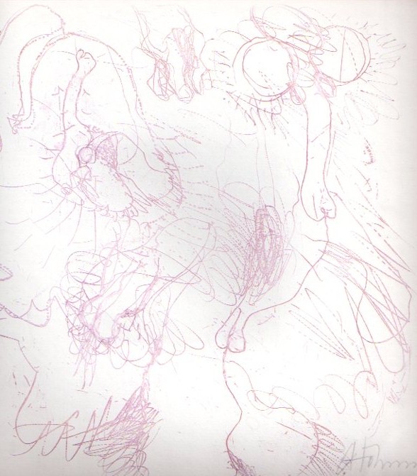 Hoehme, Gerhard – Dieter Hülsmanns: Erinnerungen eines Erotomanen. Mit fünf Radierungen von Gerhard Hoehme. Auflage 300 Exemplare. Köln. Wolfgang Hake Verlag. 1966. 25 x 25 cm. 17 Blatt. OKarton. Ihne den transparenten Kunststoffumschlag. Einband minimal angestaubt, sonst sehr gutes Exemplar. Eins von 130 (gesamt 300, Nr. 131-300 waren nicht für den Handel bestimmt) nummerierten Exemplaren mit 5 erotischen Originalfarbradierungen von Gerhard Höhme, jedes Blatt signiert und datiert 66. Ferner im Impressum von Dieter Hülsmanns in Bleistift signiert.[Vgl.Heuer: Hoehme Druckgrafik, Nr. 92-96, S. 119-121 mit Abbildungen; Spindler 158.25].