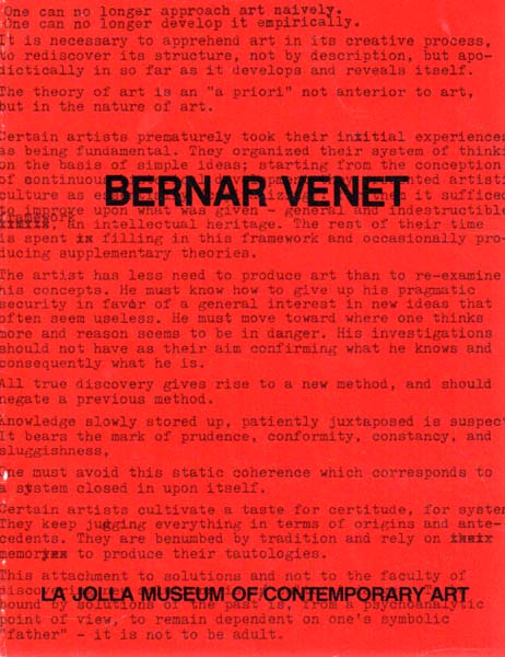 Venet, Bernar: La Jolla Museum of Contemporary Art. November 5 – December 5, 1976. First printing. La Jolla. La Jolla Museum of Contemporary Art. 1976. 28 x 21 cm. 47 S., 1 Blatt. OKarton. Umschlag am Rücken marginal berieben. Sehr gutes Exemplar. Durchgehend mit Abbildungen versehen. Mit Texten (in Englisch) von Bernar Vernet und Thierry Kuntzel.