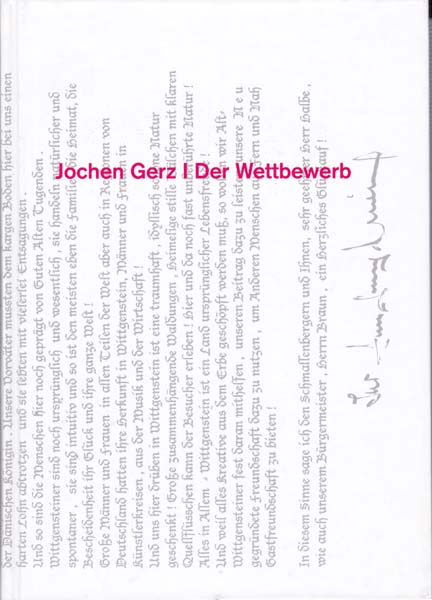 Gerz, Jochen: Der Wettbewerb. Erste Auflage. Köln. Wienand Verlag. 2004. 24,5 x 17,5 cm. 161 S., 1 Blatt. OPappband. Einband mit minimalsten Randbereibungen. Sonst sehr gutes Exemplar. Aktion von Jochen Gerz über die Rivalität zwischen den Städten Schmallenberg und Bad Berleburg dargestellt in Briefen der Bewohner und Fotografien.