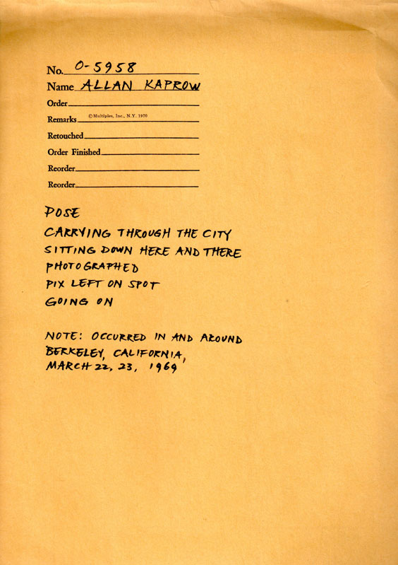 Kaprow, Allan: Pose. Carrying Through the City, Sitting Down Here and There, Photographed, Pix Left on Spot, Going On. March 2, 1969. New York. [Multiples]. 1970. 30 x 23 cm. 6 lose Karten in Briefumschlag. OPapier-Kuvert. Umschlag teils etwas knitterspurig, sonst gutes Exemplar. Erste Ausgabe, erschienen als Teil der Multiple-Box „Artists and Photographs“ in 1200 Exemplaren. Das handschriftlich beschriftete Kuvert enthält 6 Karten mit „Posen“ in unterschiedlichen Situationen.
