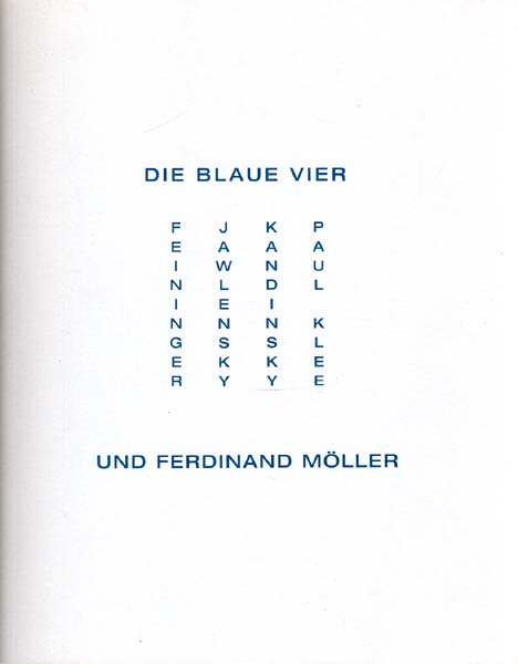 Die Blaue Vier. Eine Sonderausstellung und Publikation zur Erinnerung an den Kunsthändler Ferdinand Möller 1882 – 1956. Auflage in 1000 Exemplaren. Düsseldorf. Wolfgang Wittrock Kunsthandel. 2001. 23 x 18 cm. 42 S. OKarton. Einbandrücken minimal lichtrandig, Kanten minimal berieben. Sonst sehr gutes Exemplar. Bearbeitet von Stefan Frey. Mit Feininger, Jawlensky, Kandinsky, Paul Klee. Erschienen anlässlich der Austellung des Wittrock Kunsthandel Düsseldorf, an der Kunstmesse Art in Basel vom 13. – 18. Juni 2001.