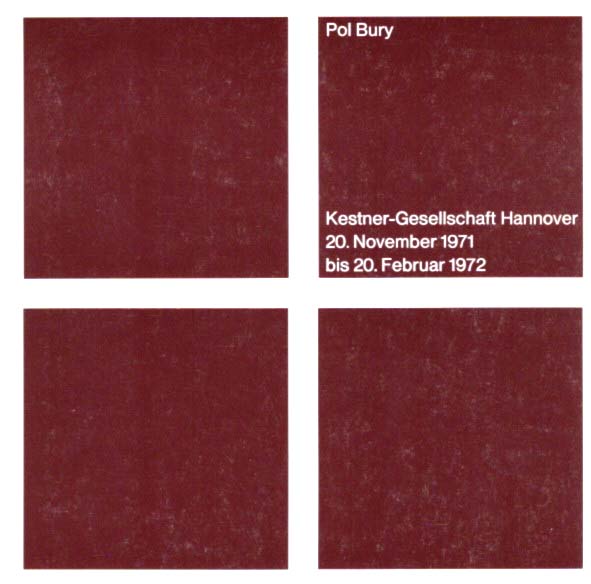 Bury, Pol: Kestner-Gesellschaft Hannover. 20. November 1971 bos 20. Februar 1972. Katalog 1/1971 – 72. Kestner-Gesellschaft Hannover. Erste Ausgabe. Hannover Kestner-Gesellschaft. 1971. 21 x 21 cm. 162 S. 1 Bl. OKarton. Gutes bis sehr gutes Exemplar. Katalog auf verschiedenen Papieren gedruckt. Beiliegend die Einladungsklappkarte in gleicher Größe.