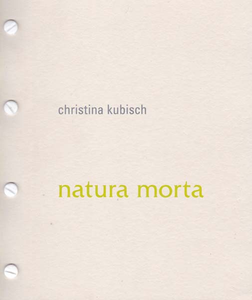 Kubisch, Christina: natura morta. Erste Auflage. Berlin. Neuer Berliner Kunstverein. 1992. 25 x 21 cm. 65 S. OKarton mit Schraubenbindung. Einbandkanten etwas nachgedunkelt. Sonst sehr guts Exemplar. Katalohg zur Ausstellung Berlin 7. März bis 18. April 1992. Durchgehend mit Abbildungen versehen.