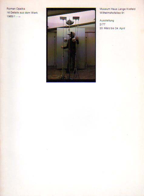 Opalka, Roman: 16 Details aus dem Werk. 1965/1 – unendlich. Erste Auflage. Krefeld. Kaiser Wilhelm Museum. 1977. 23 x 17 cm. 34 unpaginierte S., inklusive Einband-Innenseiten. OKarton. Etwas llichtrandig bzw. nachgedunkelt, sonst gutes Exemplar. Ausstellung 2/77. Mit einem Textbeitrag von Gerhard Storck. Enthält 24 s/w Abbildungen. Erschien anläßlich der Ausstellung im Museum Haus Lange, Krefeld, 20. März bis 24. April 1977.