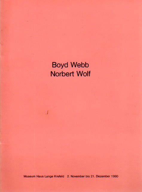 Webb, Boyd [und] Norbert Wolf: Boyd Webb. Norbert Wolf. Museum Haus Lange Krefeld, 2. November bis 21. Dezember 1980. Erste Auflage. Krefeld. Kaiser Wilhelm Museum. 1980. 23 x 17 cm. 16 unpaginierte S. OKarton. Einband mit winzigem Fleckchen, minimal lichtrandig und angestaubt, sonst gutes Exemplar. Enthält 8 farbige Werkabbildungen.