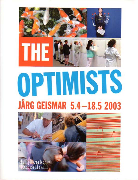 Geismar, Jarg: The Optimists. 5.4. – 18.5.2003. Erste Auflage. Stockholm. Liljevalchs konsthall. 2003. 27 x 21 cm. 87 S. OKarton. Sehr gutes Exemplar. Liljevalchs katalog nr 460. Text in Schwedisch, mit Englischer und Deutscher Übersetzung am Ende des Katalogs. Mit einem Vorwort von Bo Nillson und einem Beitrag von Niclas Östlind. Durchgehend mit meist farbigen Abbildungen versehen.