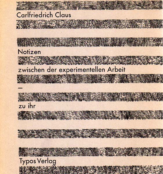 Claus, Carlfriedrich: Notizen zwischen der experimentellen Arbeit – zu ihr. Erste Auflage. Frankfurt am Main. Typos Verlag. 1964 21 x 19,5 cm. 36 S. OKarton. Leicht lichtrandig, mit kleinen Bereibungen an den Kanten. Sonst sehr gutes Exemplar. Zusammenstellung der Notizen Carlfriedrich Claus’, in welchen sich die Pozesse zwischen Sprache, Text und Schrift abspielen. Erschienen anlässlich der Ausstellung der Staatlichen Kunsthalle Baden-Baden vom 21. Januar – 27. Februar 1964. Mit schwarz-weiß Abbildungen versehen.