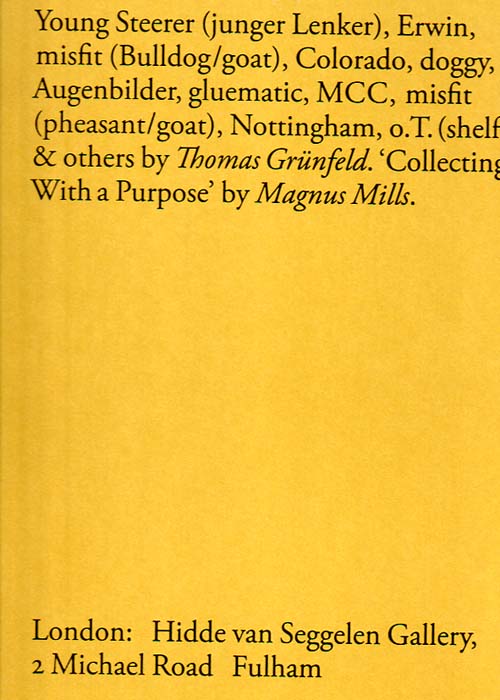 Grünfeld, Thomas: Young Steerer (junger Lenker), Erwin misfit (Bulldog/goat), Colorado, doggy, Augenbilder, gluematic, MCC, misfit (pheasant/goat), Nottingham, o.T. (shelf) & others. First printing. London. Hidde van Seggelen Gallery. 2011. 33 x 24 cm. 46 S., 1 Blatt. OHalbleinen in Blockbuchbindung. Verlagsfrisches, neuwertiges Exemplar – originalverschweißt. Als Künstlerbuch herausgegebener Katalog, mit einem Text von Magnus Mills in Englisch. Durchgehend mit farbigen Abbildungen versehen.
