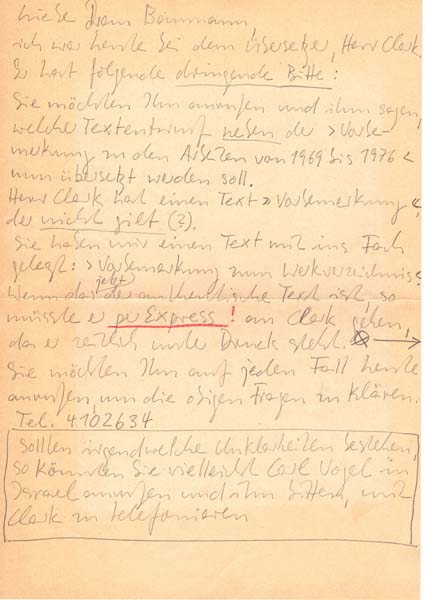 Walther, Franz Erhard: Handschriftlicher Brief. 29,5 x 21,0 cm. 1 Blatt. Papierbedingt gebräunt. Miuttig ein mal gefaltet. Gutes Exemplar. Zweiseitiger Brief, DIN A4, in Bleistift auf einfachem Papier. An Jo Baumann bezüglich einer Übersetzung der „Vorbemerkungen zu den Arbeiten von 1968 bis 1976“. Mit Markierungen, Unterstreichungen und Einfassungen. Nicht datiert, signiert „Walther“. Wohl Ende der 70er Jahre. (Jo – das ist Jo(hanna) Baumann, damals Chefsekretärin beim damaligen Direktor der Hochschule für Bildende Künste in Hamburg, Carl Vogel. Franz Erhard Walther war 35 Jahre Professor an der Hochschule für Bildende Künste).
